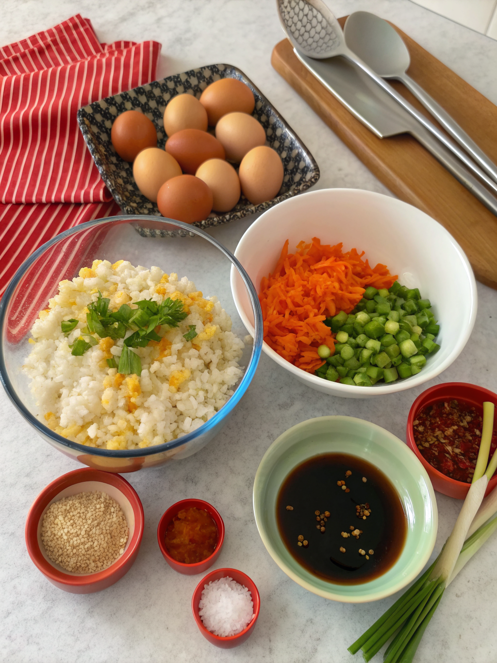 Gathering your ingredients is the first exciting step on our culinary adventure. Each component plays a crucial role in delivering that irresistible spicy Eggs fried rice flavor.