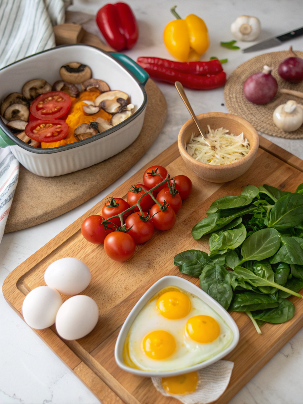 Gathering your ingredients is the first step to culinary success. Here’s what you’ll need for a delightful baked Eggs and vegetable medley: